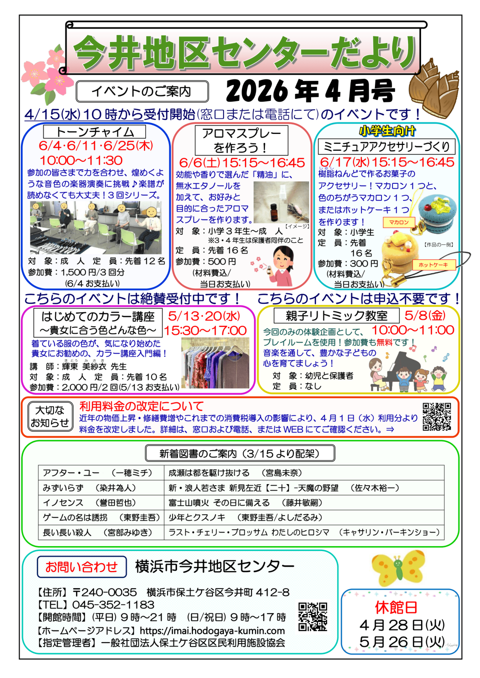 今井地区センターは、地域のみなさまが自主的な「活動」と「交流」を通じ、地域コミュニティを形成していただくことを目的として設置されています。さまざまな「サークル活動」や「集会」・「スポーツ」など、生涯学習の場としてご利用ください。