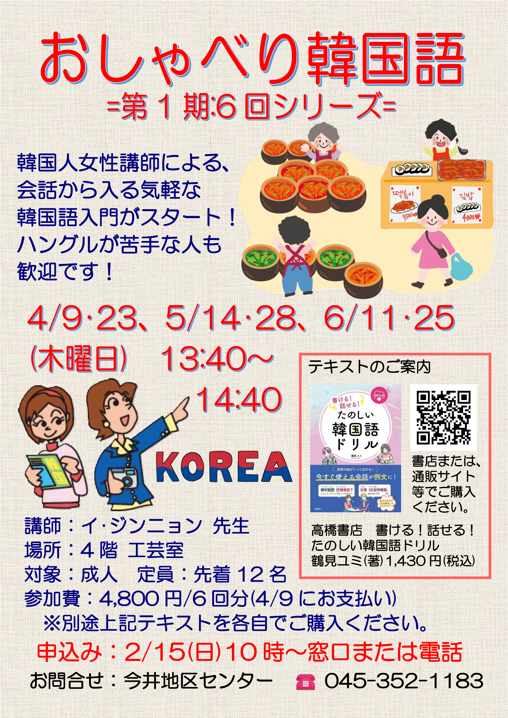 | 持ち物 | 別途以下のテキストを各自でご購入ください。 高橋書店「書ける!話せる!たのしい韓国語ドリル」鶴見ユミ(著) 1,430円(税込) 書店または通販サイト等でご購入ください。 |