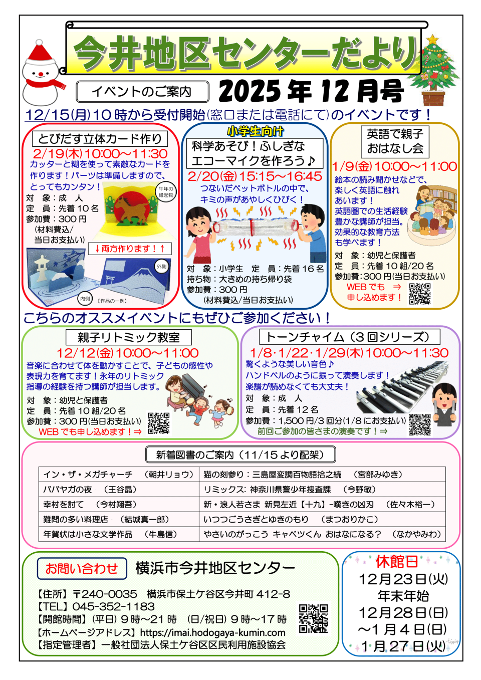 12/19 (金) 15:15〜16:45 「立体カード作り(小学生向け)」